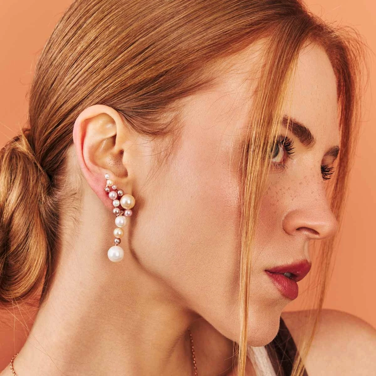 O Brinco Beth com Pérolas e Banho de Ouro Rosé é a união perfeita entre tradição e sofisticação. Seu design delicado valoriza a elegância atemporal das pérolas em tons variados, realçadas por um banho de ouro que reforça o brilho suave e o toque refinado da peça.