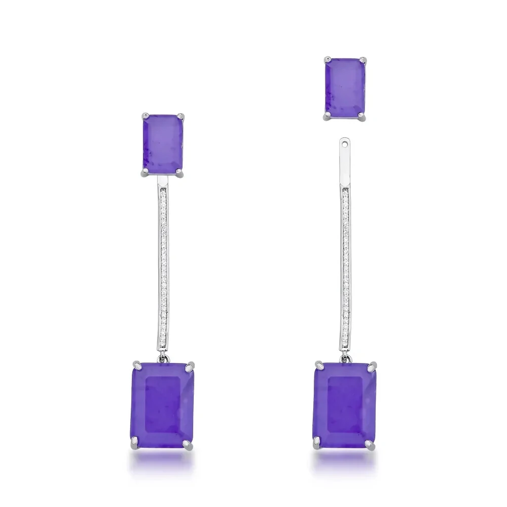 Seu design destaca cristais roxos lapidados em formato retangular e uma haste fina cravejada de zircônias, criando um jogo visual moderno, delicado e cheio de personalidade. O banho de ródio branco garante brilho intenso, durabilidade e acabamento impecável.