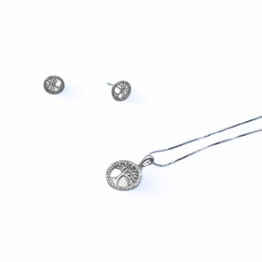 Conjunto Árvore da Vida com Banho de Ródio Branco e Zircônias cravejadas