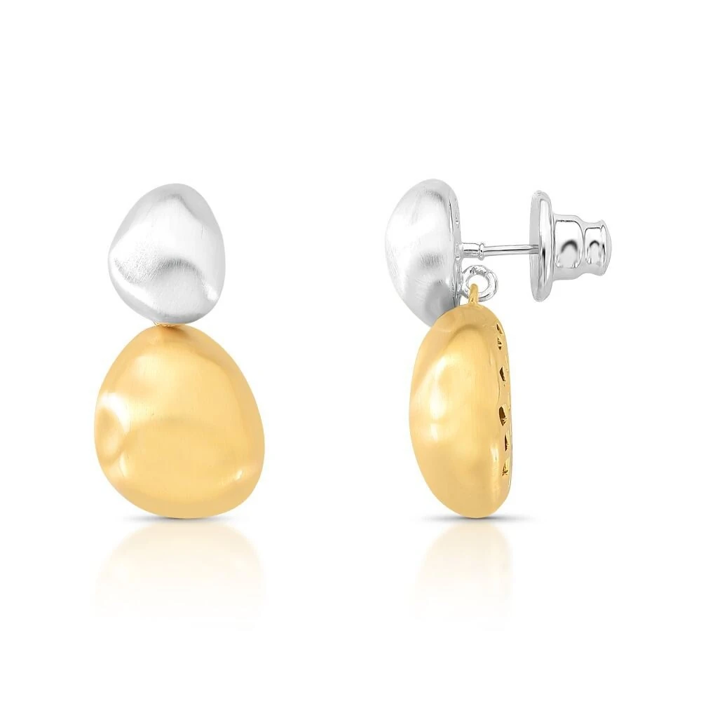 O Brinco Uova Pendente é a escolha perfeita para quem busca versatilidade com personalidade. Seu design bicolor combina o calor do banho de ouro 18K com a modernidade do banho de ródio branco, criando um contraste visual elegante e contemporâneo. As formas orgânicas em formato de gota trazem movimento e leveza ao rosto, enquanto o acabamento polido garante brilho intenso em ambos os tons.