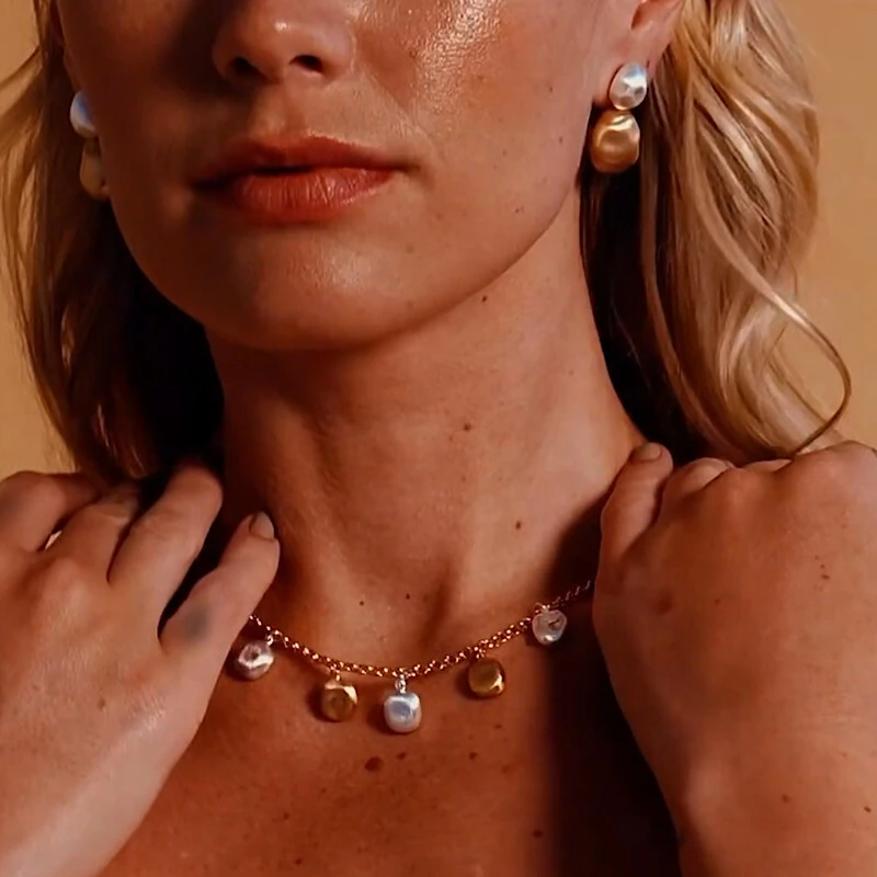 O Colar é a escolha perfeita para quem busca versatilidade com personalidade. Seu design bicolor combina o calor do banho de ouro 18K com a modernidade do banho de ródio branco, criando um contraste visual elegante e contemporâneo. Os pingentes em formas orgânicas trazem movimento e leveza ao pescoço, enquanto o acabamento garante brilho intenso em ambos os tons.