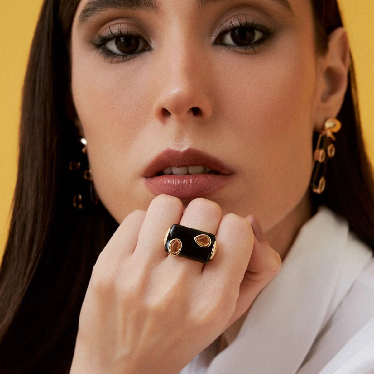 O Anel Miles traduz sofisticação contemporânea com seu esmalte preto intenso, cristais delicadamente aplicados e acabamento em banho de ouro 18K. A composição cria um contraste elegante e refinado que valoriza as mãos e imprime personalidade ao visual.