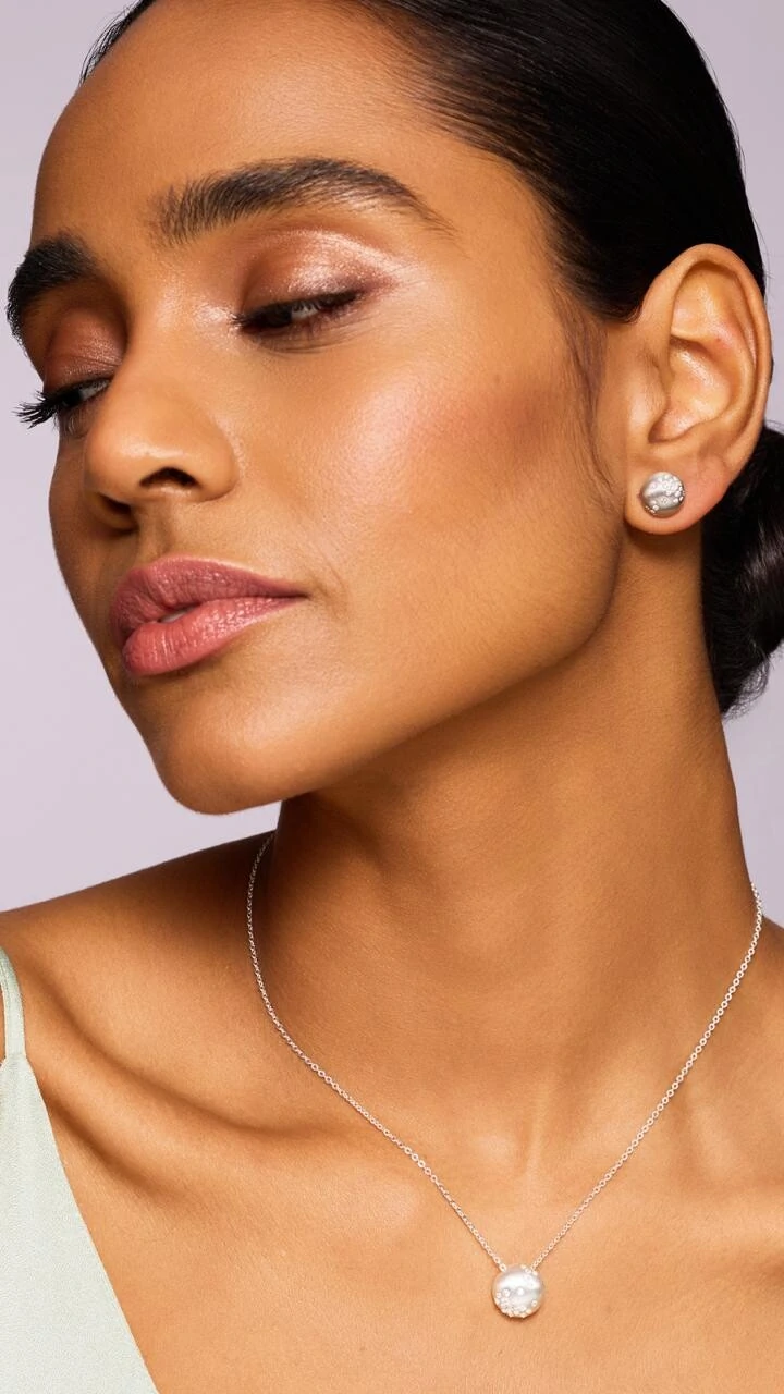 O banho de Ródio Branco intensifica a tonalidade quente da peça, enquanto as zircônias adicionam pontos de luminosidade estratégicos, criando um efeito sutil e sofisticado no colo e no rosto.