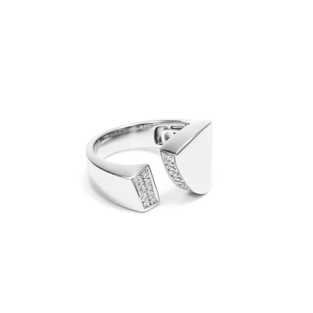 O detalhe em zircônias adiciona brilho delicado e contraste refinado ao design, criando um equilíbrio perfeito entre minimalismo e sofisticação. As linhas limpas e estruturadas trazem um toque arquitetônico ao anel, tornando-o uma escolha moderna e versátil.