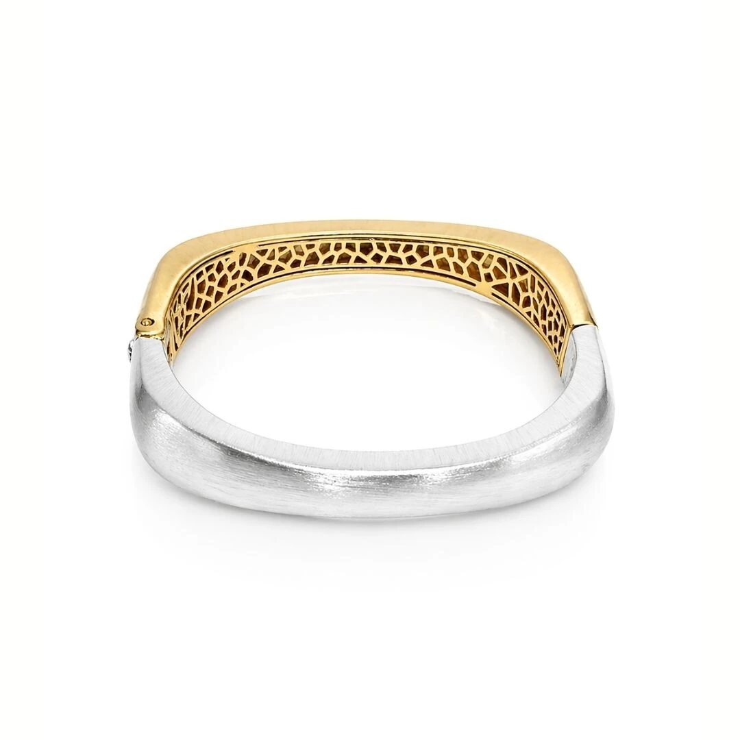 O mix de banhos — ouro e ródio branco — cria um contraste sutil e sofisticado, permitindo combinações versáteis com diferentes estilos e acessórios. O interior trabalhado adiciona um detalhe exclusivo, reforçando o cuidado com cada elemento da peça.