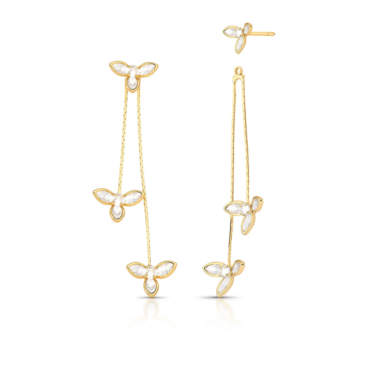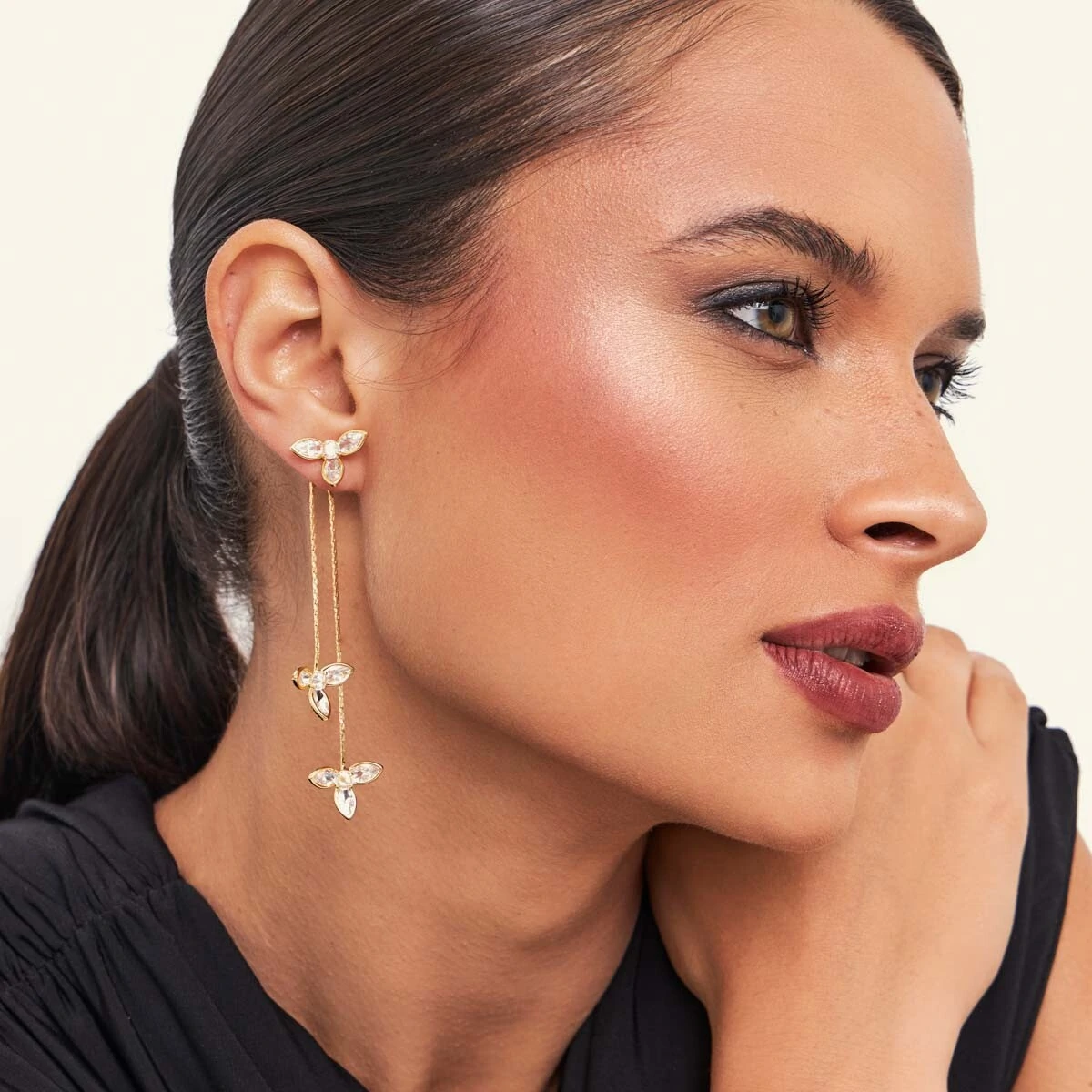 Delicado, leve e com movimento encantador, o Brinco Luhli com Zircônias é a definição de elegância contemporânea. Seu design alongado, composto por delicadas formas que lembram pequenas pétalas ou asas, cria um efeito fluido e sofisticado que valoriza o rosto com suavidade.