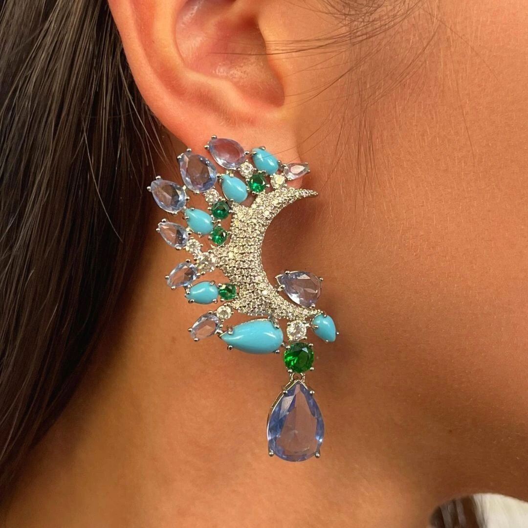 Brinco médio em meia lua toda cravejada em zircônias brancas com diversos cristais lilás em volta das zircônias intercalados com delicadas turquesas reconstituídas.